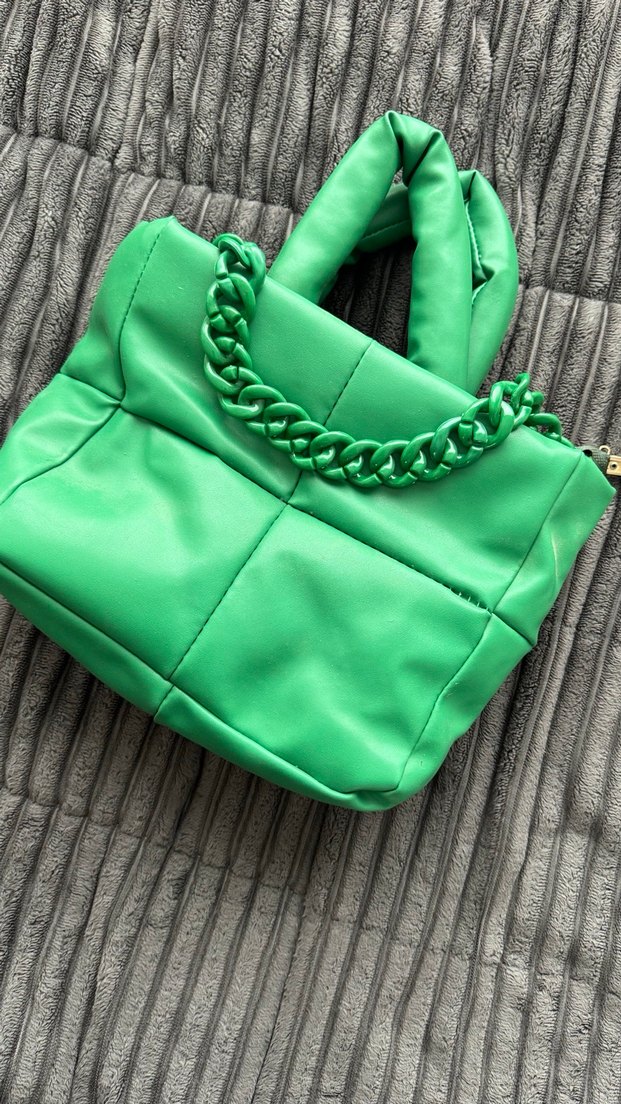 Zincir detaylı, parlak yeşil deri kadın çanta. Düz ve pürüzsüz yüzeye sahip, sokak stili ve günlük kullanıma uygun.