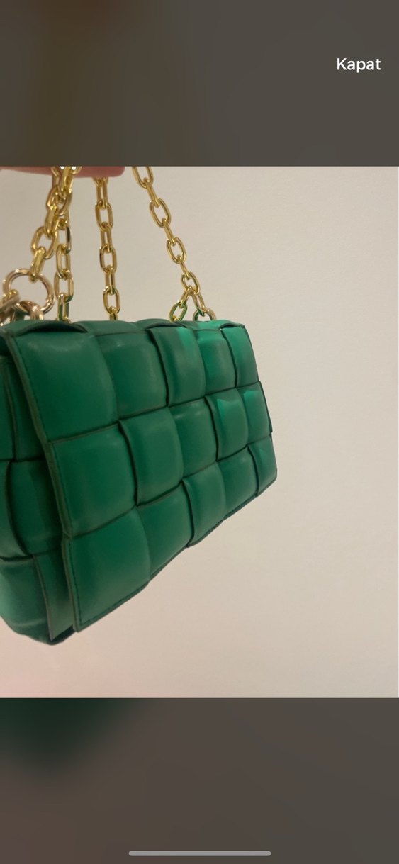 Parlak yeşil deri, zincir detaylı ve kareli desenli kadın çantasıdır. Cesur Paris tarzını yansıtan sokak modası stiliyle günlük kullanıma uygundur.