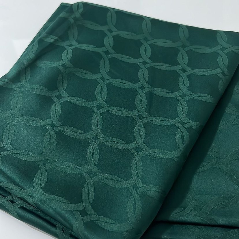 Parlak yeşil sentetik kumaştan, zincir desenli kadın şalı, iş hayatına uygun sade tarzda.