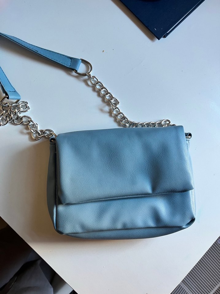 Pastel mavi deri kadın çanta, zincir detaylı askıya sahip. Desensiz ve sade tasarımıyla günlük sokak stiline uygun.
