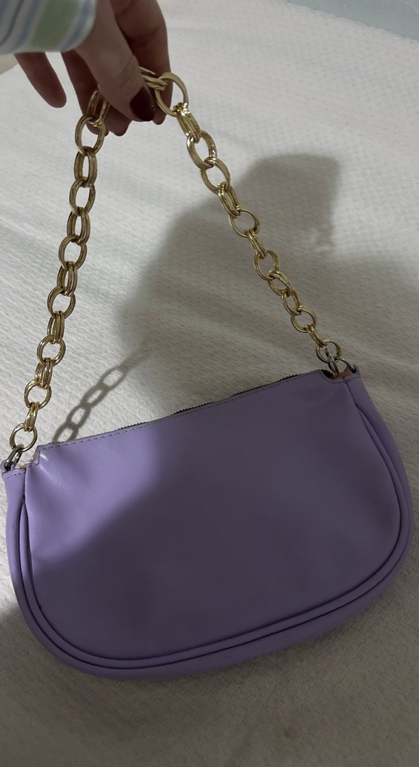 Pastel mor renkte deri çanta, zincir detaylıdır. Minimalist tasarımı ve desensiz yapısıyla günlük sokak stiline uygundur.