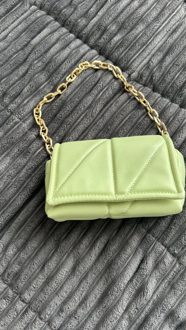 Pastel yeşil renkte, zincir detaylı kadın çantası, sentetik kumaştan yapılmıştır ve çağdaş bir tarz sunar.