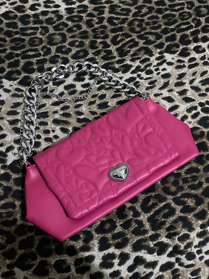 Zincir detaylı, parlak pembe deri kadın çanta, kalp şeklinde tokasıyla romantik gece için uygun şık bir seçim.