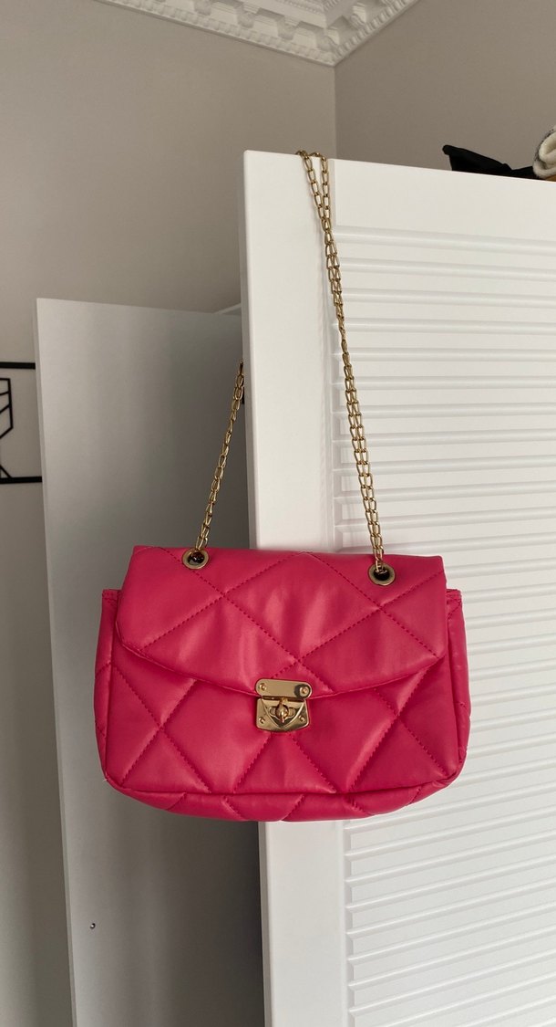 Zincir detaylı, kapitone desenli pembe deri kadın çanta. Altın renkli toka ve günlük sokak stiline uygun, cesur Paris tarzı.