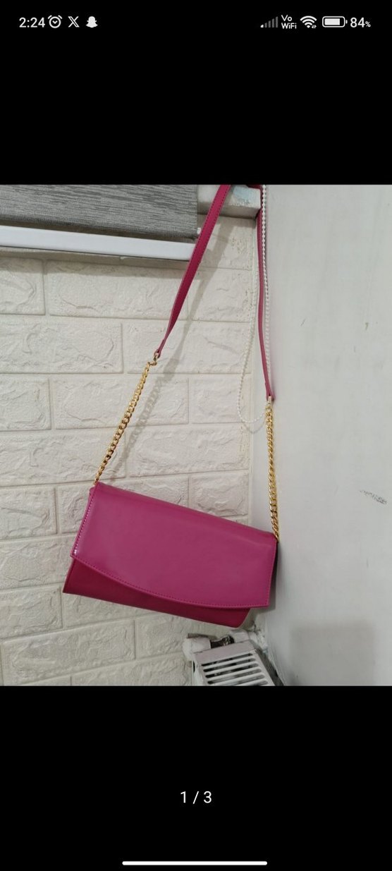 Zincir detaylı, pembe deri kadın çanta, minimalist ve çağdaş tasarıma sahip, günlük kullanıma uygun, canlı renkte ve cesur bir tarzı yansıtıyor. orjinal