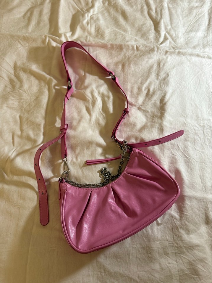 Pastel pembe renkte, zincir detaylı ve ayarlanabilir askılı deri kadın çantası. Sokak modasına uygun, günlük kullanıma ideal, desensiz tasarım. TERTEMİZDİR.