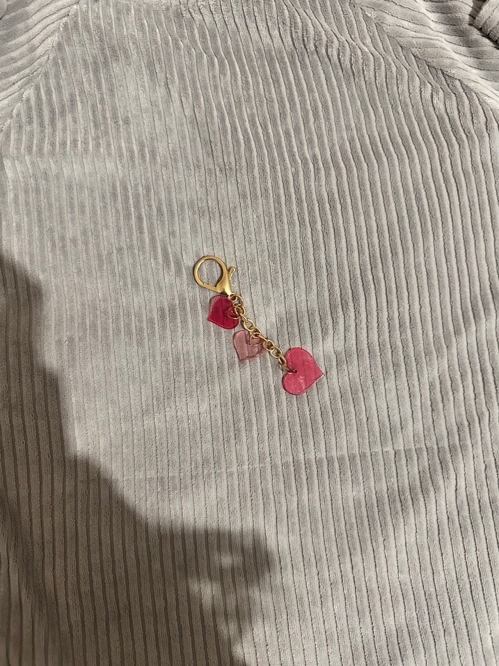 Kadın anahtarlık, zincir detaylı ve üç pastel pembe kalp figürlü, trend sokak stili için uygun.