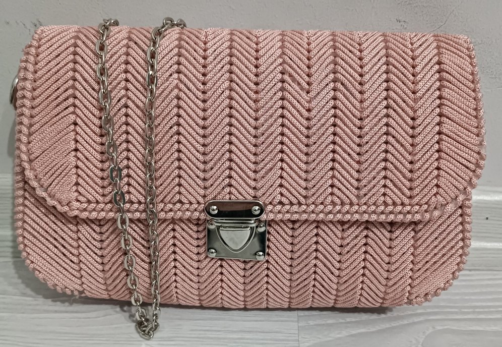 Pembe nakışlı sentetik kumaştan, zincir detaylı ve gümüş kapaklı kadın çantası, modern klasik ve Paris tarzı şıklığını yansıtıyor.