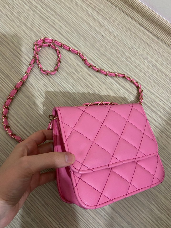 Pembe pastel renkli, zincir detaylı ve kapitone desenli kadın deri çanta, sokak modasına uygun şık bir parça.