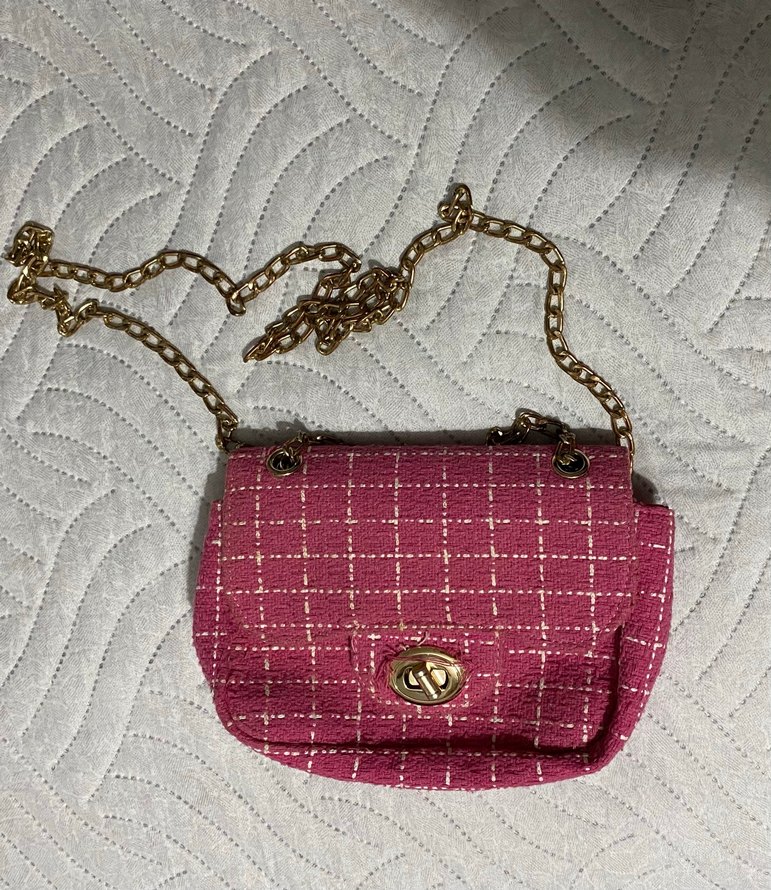 Zincir askılı, parlak pembe kareli sentetik kumaştan yapılmış, toka kapamalı kadın çantası. Sokak modasına Paris esintisi katıyor.