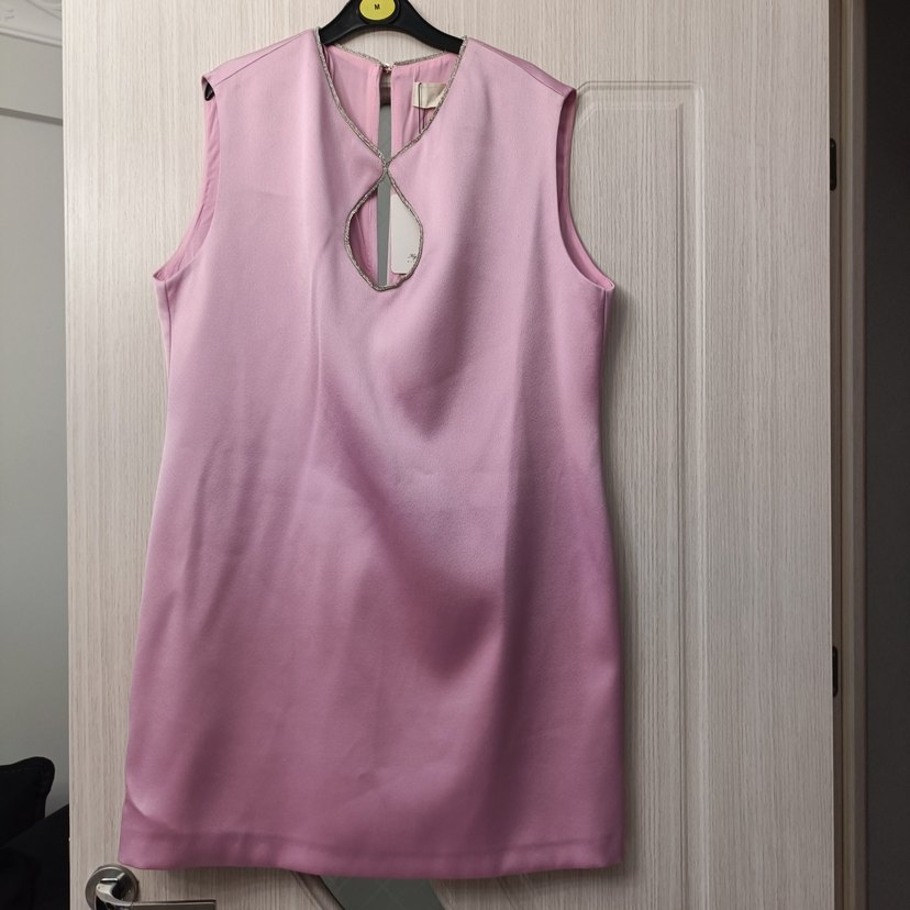 Pastel pembe, kolsuz midi elbise, V yaka ve zincir detaylı. Normal kesim, minimal desen ve günlük kullanıma uygun.