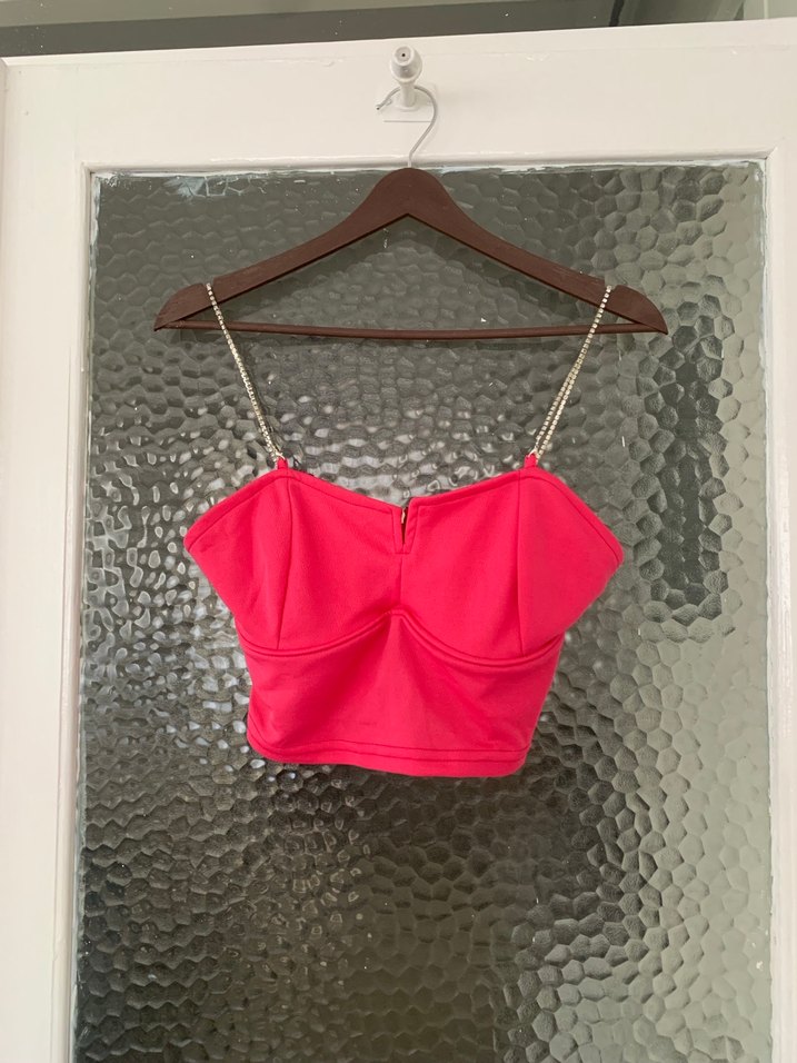 Zincir detaylı askılı, straplez yaka ve kısa kesim pembe mini büstiyer. Sentetik kumaştan olup 34-36 bedene uygundur. Hiç giyilmedi.