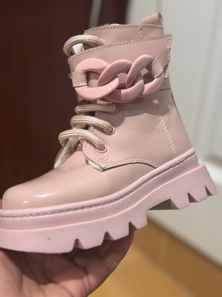 Pembe kauçuk botlar, platform topuk ve zincir detayına sahip. Sokak modasına uygun, günlük kullanıma ideal, pastel tonlarıyla yumuşak bir görünüm sunar.