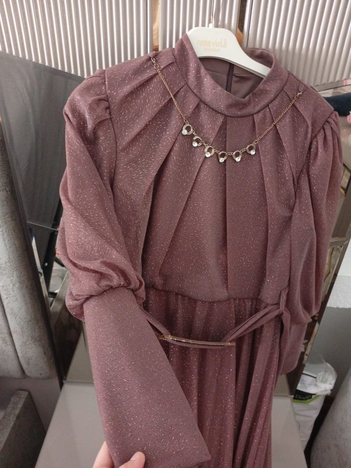 Zincir detaylı, yüksek yakalı ve bol kesim pembe uzun abiye elbise. Askılı kollu ve parlak dokusuyla modern ve şık bir tasarım sunar.✨