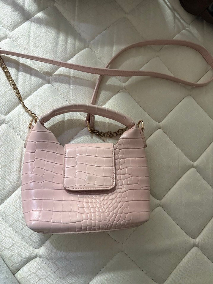 Pastel pembe renkte, yılan derisi desenli deri çanta, zincir detaylarıyla dikkat çeker. Trendy ve günlük kullanım için uygundur.