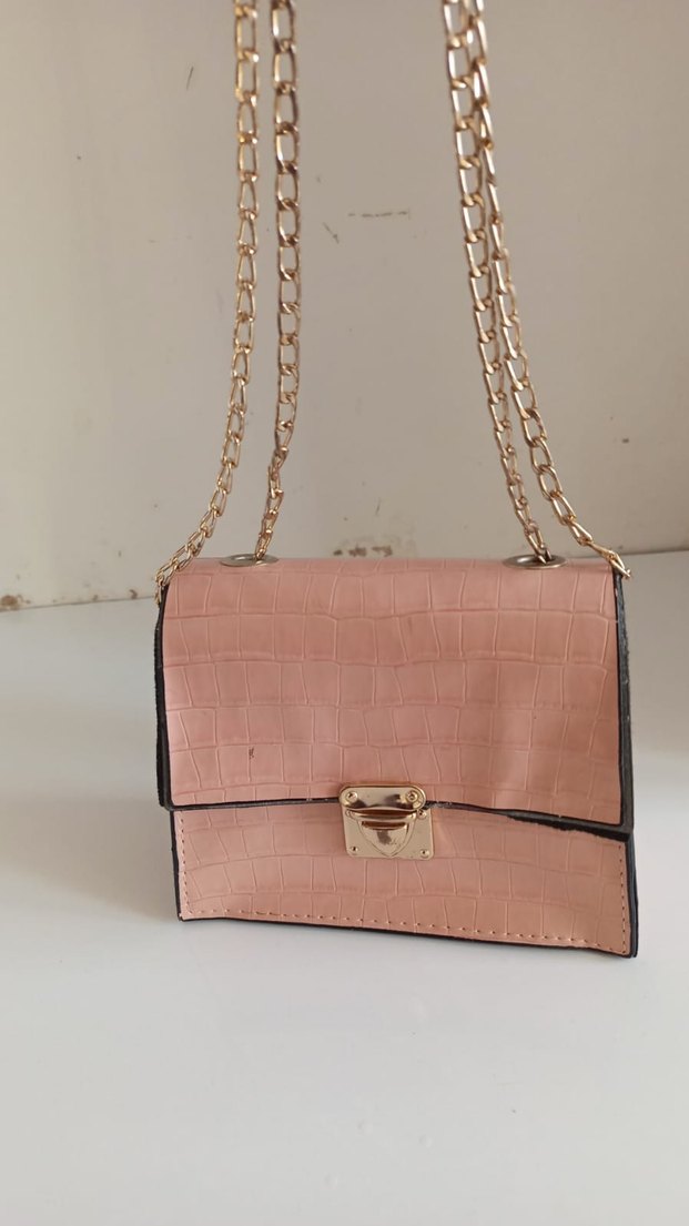 Pembe yılan derisi desenli deri çanta, zincir detaylarıyla sokak modasına uygun pastel tonlarda tasarlanmıştır.