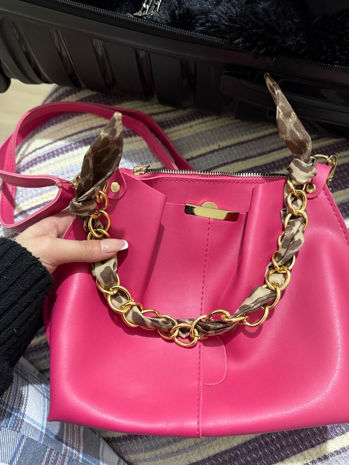 Pembe deri çanta, yılan desenli fularla sarılı altın zincir sapıyla trend ve Paris esintili sokak modası sunar. Günlük kullanım için uygundur.