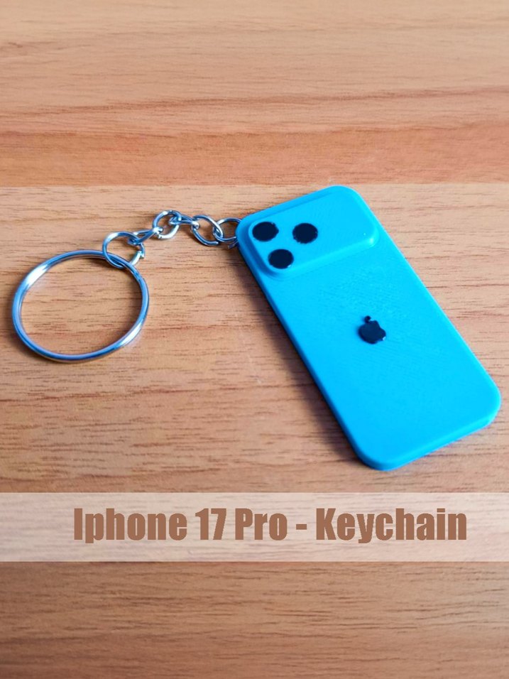 Zincir detaylı, renkli mavi telefon kılıfı anahtarlığı, counterculture tarzında, iPhone 17 Pro modelini andırır.
