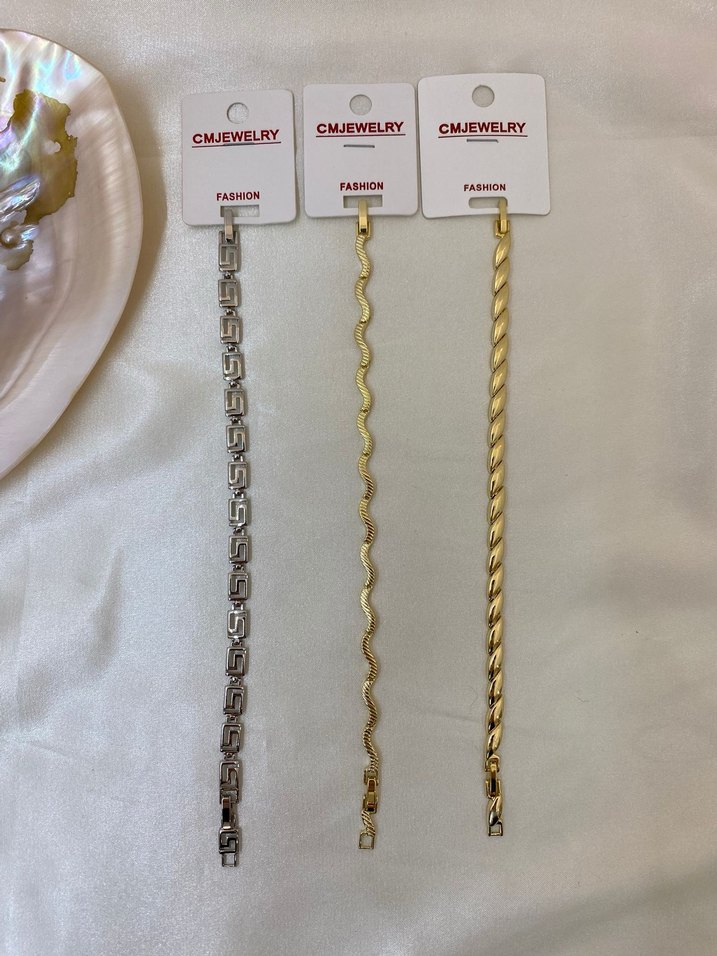 Altın ve gümüş tonlarında zincir detaylı, yılan desenli, minimalist tarzda renkli modern kadın bileklikler. Marka: CMJEWELRY. ✨