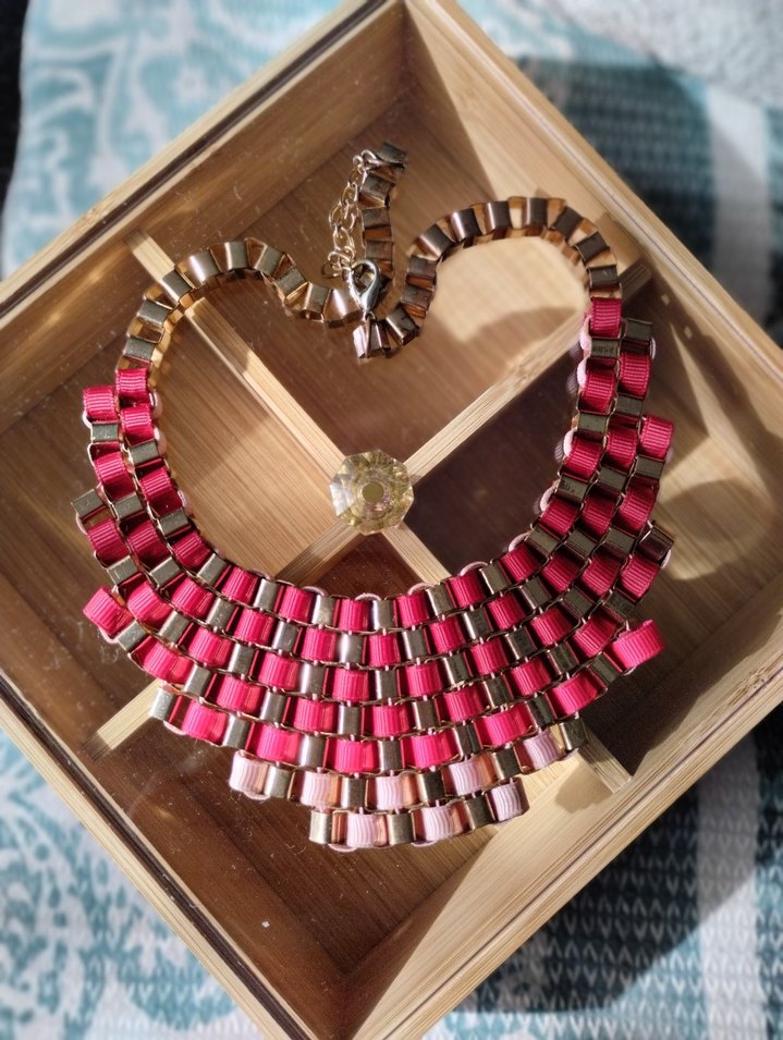 Zincir detaylı, renkli pembe midi uzunluğunda bohem tarzda kolye. Romantik akşamlar için uygundur.