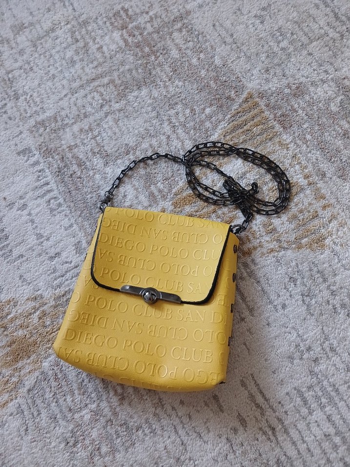 Sarı deri kadın çanta, zincir detaylı ve baskılı yazı desenli. Gri zincir askısı ve kabartma marka motifleri ile sokak stili için uygundur. Etiketi yok ama hiç kullanılmadı. MAKUL TEKLİFLERE AÇIĞIZ ☺️