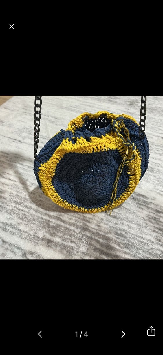 Koyu sarı ve lacivert renklerde, işlemeli detaylı örgü çanta, zincir askılı spor ve bohem tarzı bir modeldir.