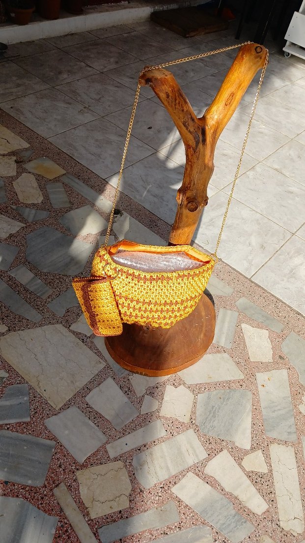 Renkli sarı örgü dokulu, nakışlı detaylara sahip kadın çantası. Zincir askısı ve bohem tarzıyla dış mekan kullanımı için uygundur. cüzdan ile birlikte