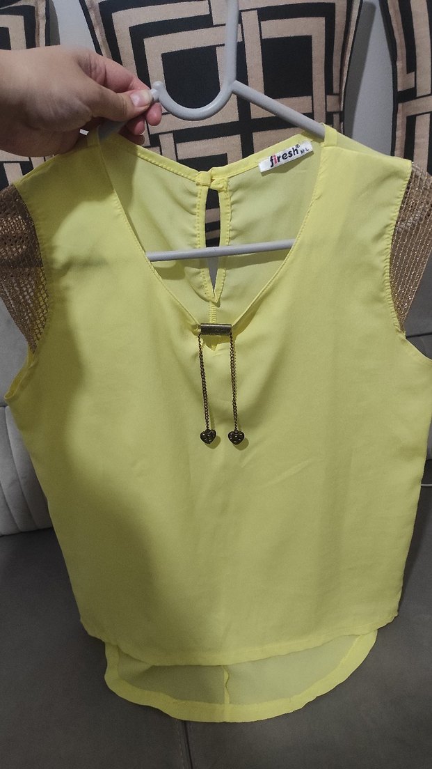 Zincir detaylı, V yaka, kolsuz sarı bluz. Gevşek kesim ve normal midi boyda. Parlak sentetik kumaştan, günlük rahat ve sokak stiline uygun. Ürün temizdir hiçbir yerinde defosu yoktur. iç gösterir. M-L bedendir.