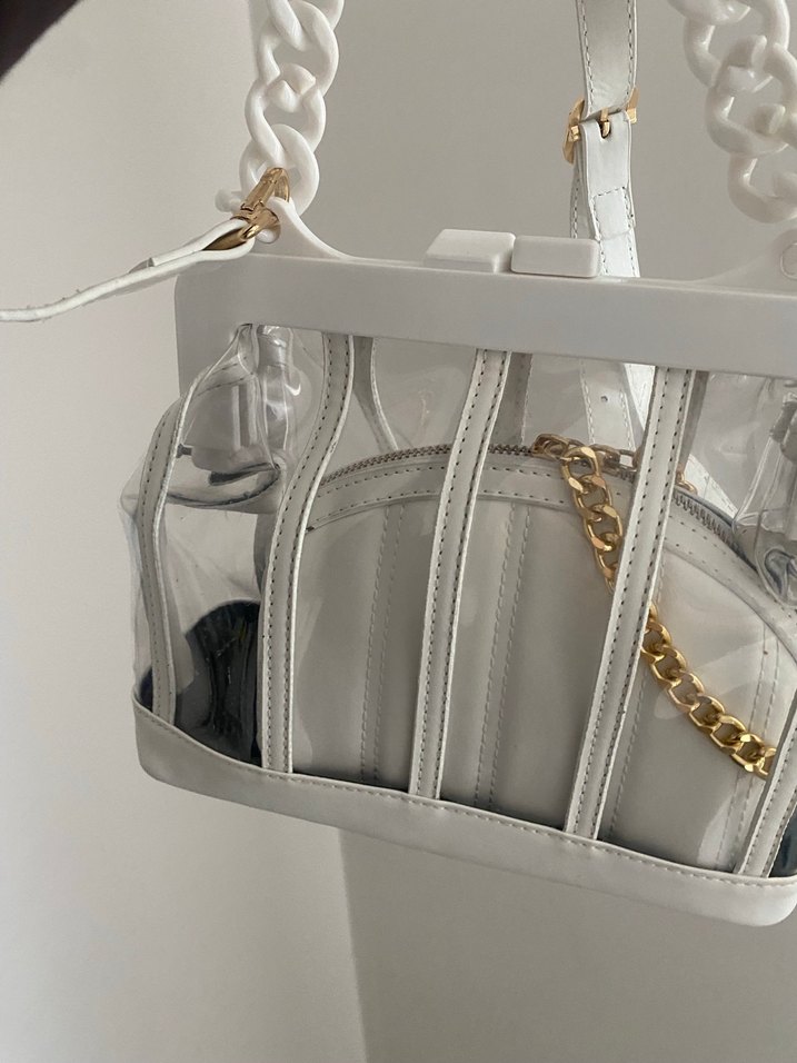Beyaz renkte, zincir detaylı şeffaf kadın çantası, gri iç kesesiyle sokak stilini Parisli avangard dokunuşla buluşturuyor. Sadece görselde belli bir vidası düştü