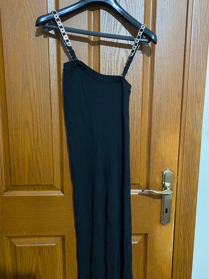 Zincir detaylı askılı, fit kesim siyah uzun elbise. Yumuşak triko kumaştan, günlük şık görünüme uygundur.
