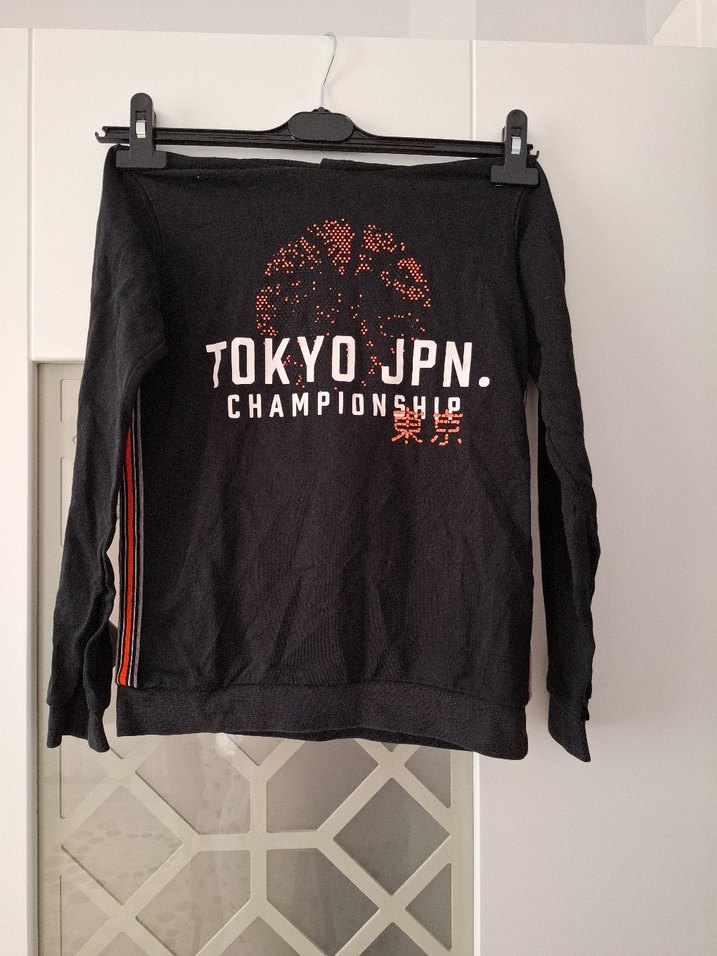 Uzun kollu, bisiklet yaka, baskılı ve zincir detaylı siyah sweatshirt. Spor ve şehir stili için uygun, Tokyo temalı baskısı vardır.