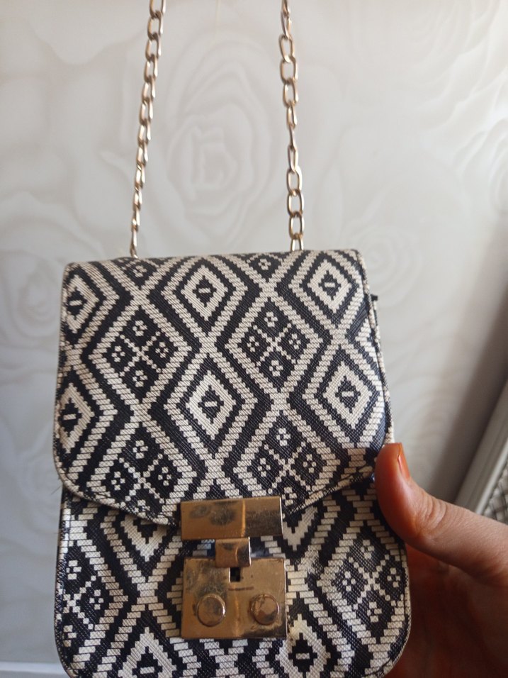 Zincir askılı, siyah beyaz geometrik desenli kadın çantası. Sentetik kumaştan üretilmiş, günlük kullanım için uygun bohem tarzda.
