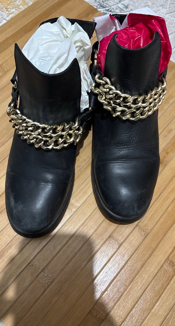 Siyah biker tarzı deri botlar, parlak altın zincir detayları ve kalın topuklu tasarımıyla rock punk havası verir.