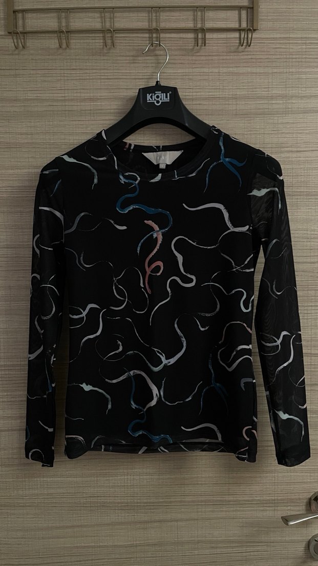 Uzun kollu, yuvarlak yaka, zincir desenli siyah bluz. Rahat ve şık sentetik kumaştan, günlük kullanıma uygun.