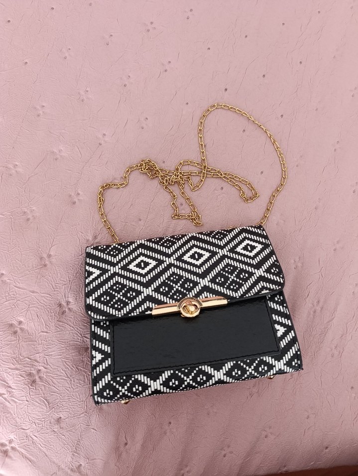 Siyah renkli, yılan desenli kadın çantası zincir detaylarına sahip. Sentetik kumaştan üretilmiş, bohem ve retro tarzıyla günlük kullanıma uygun.