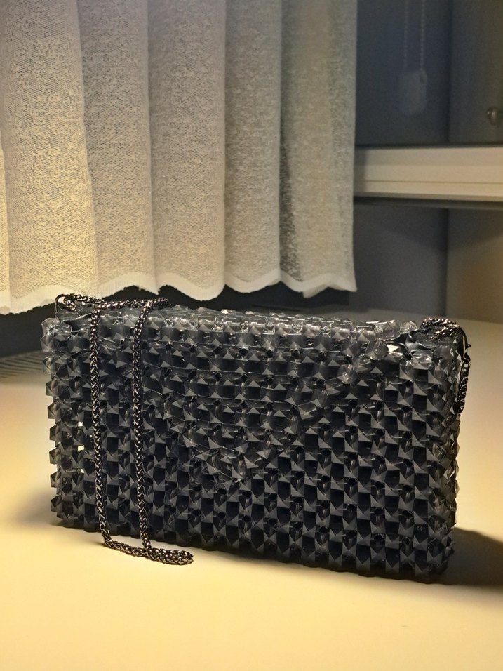Hiç kullanilmamistir. El emegiyle yapilmistir. Omuz/Kol cantasidir. Kristal boncuklarla islenmistir. Icindeki astar suni deridir. Zincir detaylari vardir.