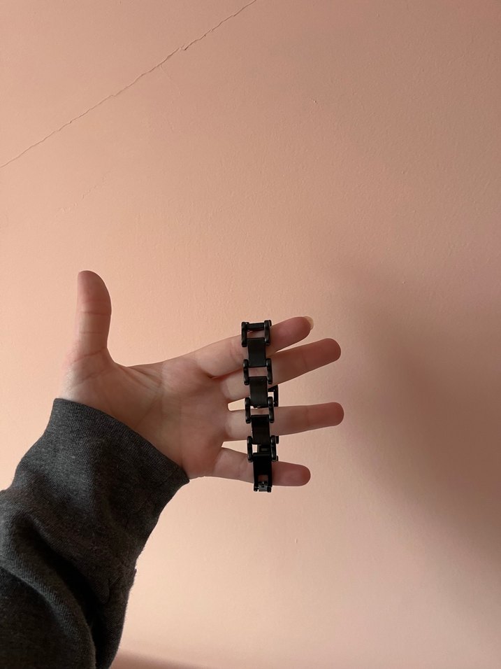 Zincir detaylı siyah kadın el zinciri, minimalist gotik tarzda. Günlük rock punk havası için uygun.