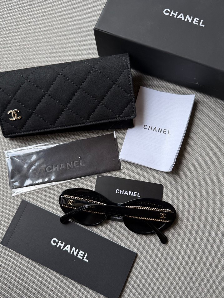 Siyah Chanel gözlükler, çerçeve boyunca zincir detayıyla modern klasik ve Paris zarafetini birleştiriyor. Kapitone kılıf ve markalı aksesuarlarla.