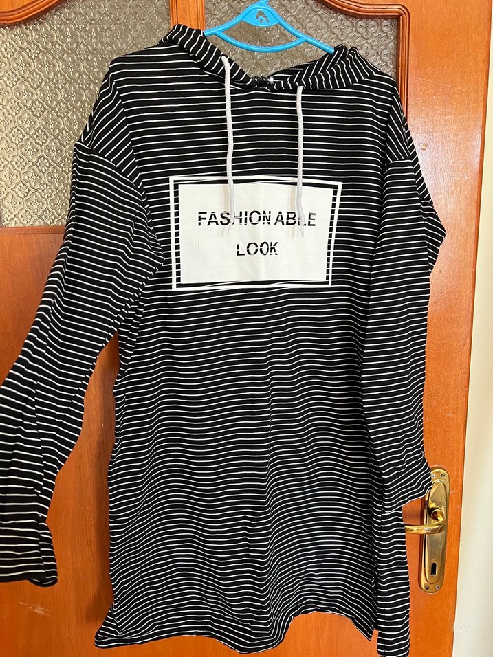 Siyah çizgili, uzun kollu ve bol kesim tunik. Zincir detaylı ve tekne yaka ile günlük rahat stil için uygun. Önünde 'FASHIONABLE LOOK' baskısı bulunur.