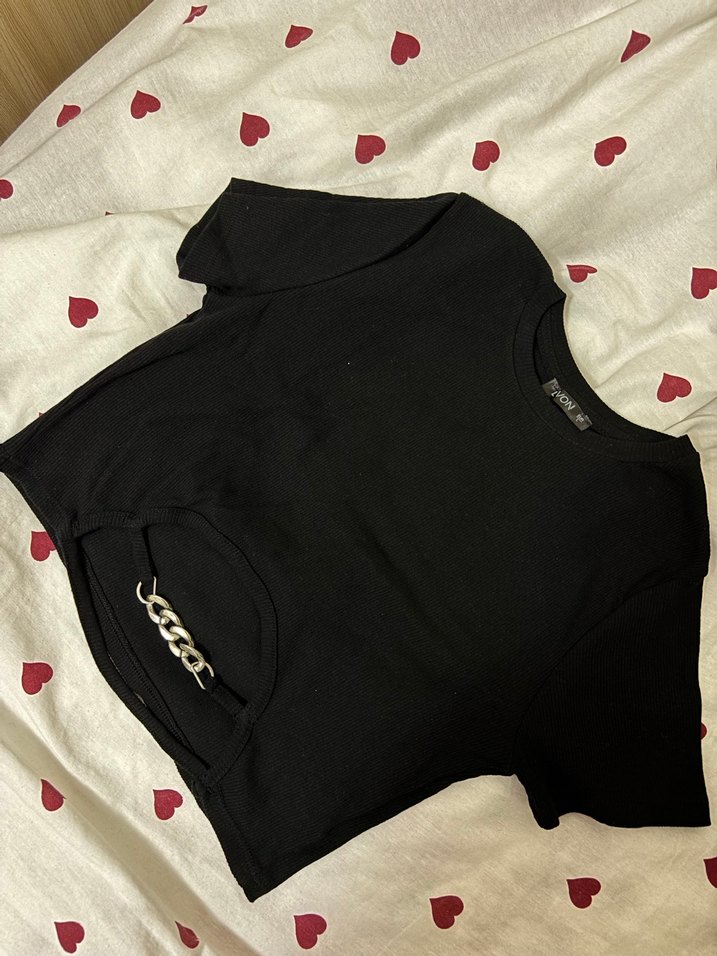 Pamuk kumaştan yapılmış, zincir detaylı, kısa kollu ve yuvarlak yaka siyah fitted crop top. Trendy gündelik stil için uygundur.