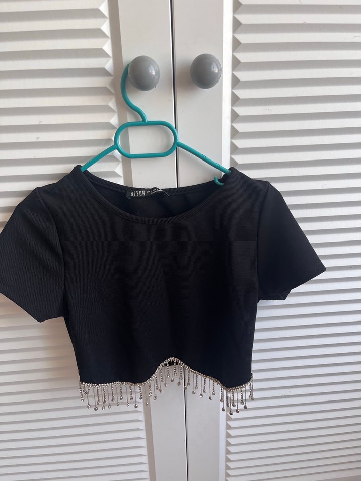 Siyah, kısa kollu ve yuvarlak yakalı bu crop top, zincir detaylarıyla sonlanır ve şık bir görünüm sunar.