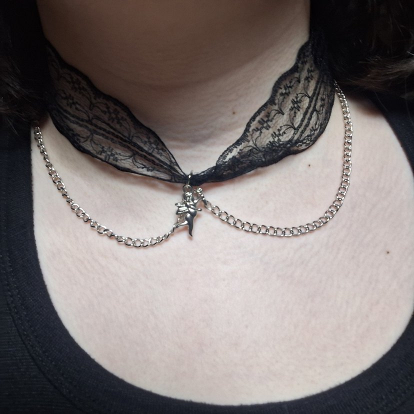 Zincir detaylı melek charmli siyah gotik midi uzunlukta kolye. Günlük kullanıma uygun, rock punk havası yansıtıyor.