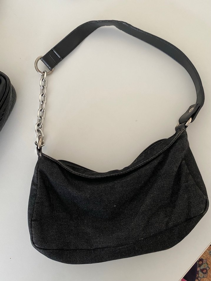 Siyah denim kumaştan yapılmış, zincir detaylı, minimalist sokak stiline uygun kadın çantası, günlük kullanım için ideal.