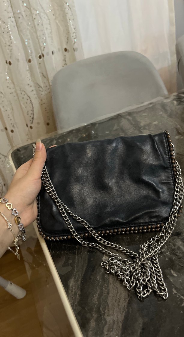 Zincir detaylı, siyah deri çanta. Rock punk tarzı ve Paris havası taşıyan günlük kullanıma uygun bir model.