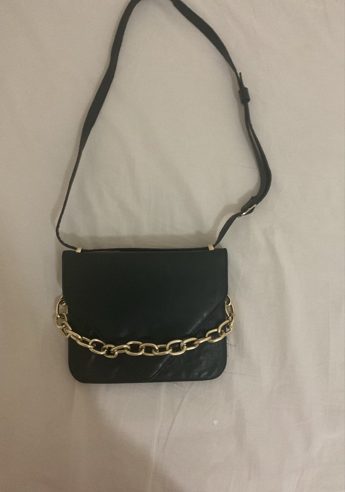Siyah deri ve zincir detaylı çanta, trend sokak stili için uygundur. Günlük kullanım için idealdir.