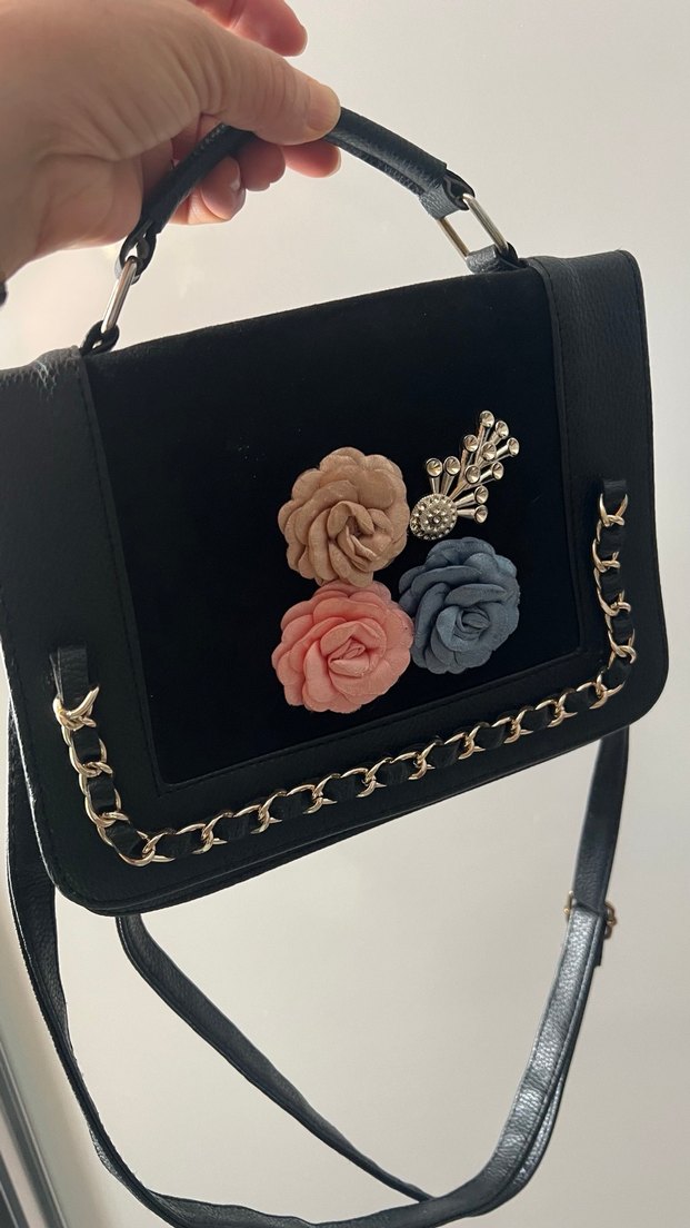 Siyah süet çantada çiçek desenleri ve zincir detayları bulunur. Gotik ve trend günlük tarzı bir araya getirir. Günlük kullanım için uygundur. Hiç bir problemi yoktur marka temsilidir