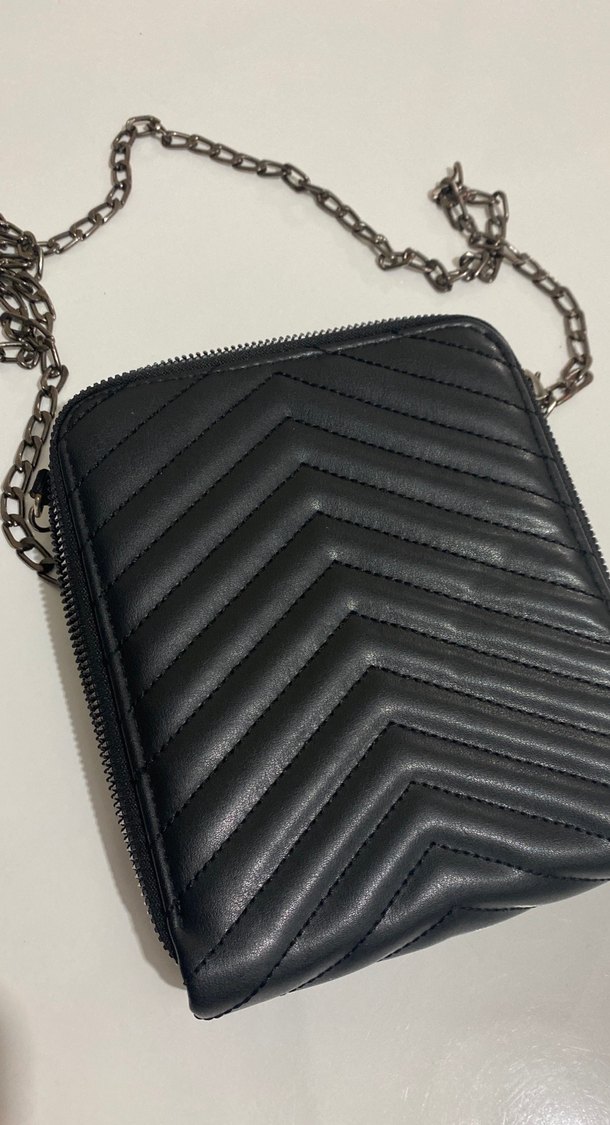 Siyah deri, çizgili desene ve zincir detaylara sahip kadın çantası. Biker tarzını Parisian dokunuşla birleştirir. Günlük kullanıma uygun, trend casual tarzda.