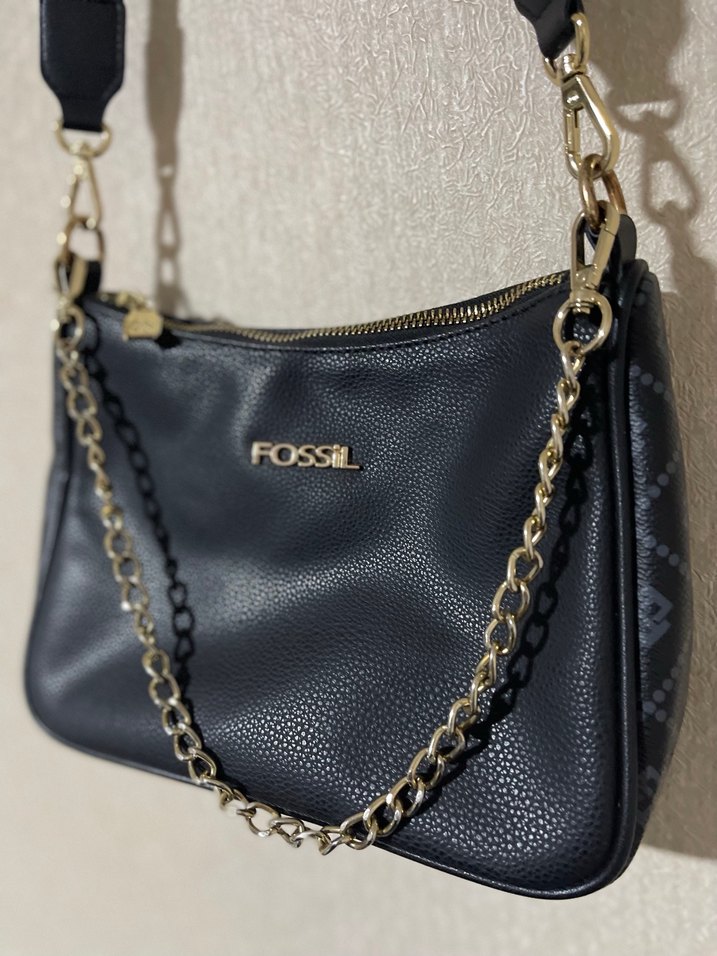 Fossil markalı siyah deri kadın çanta, parlak zincir detayı ve baskılı deseniyle günlük sokak modasına uygun şık bir seçim. Defosuz ve temiz ürün.