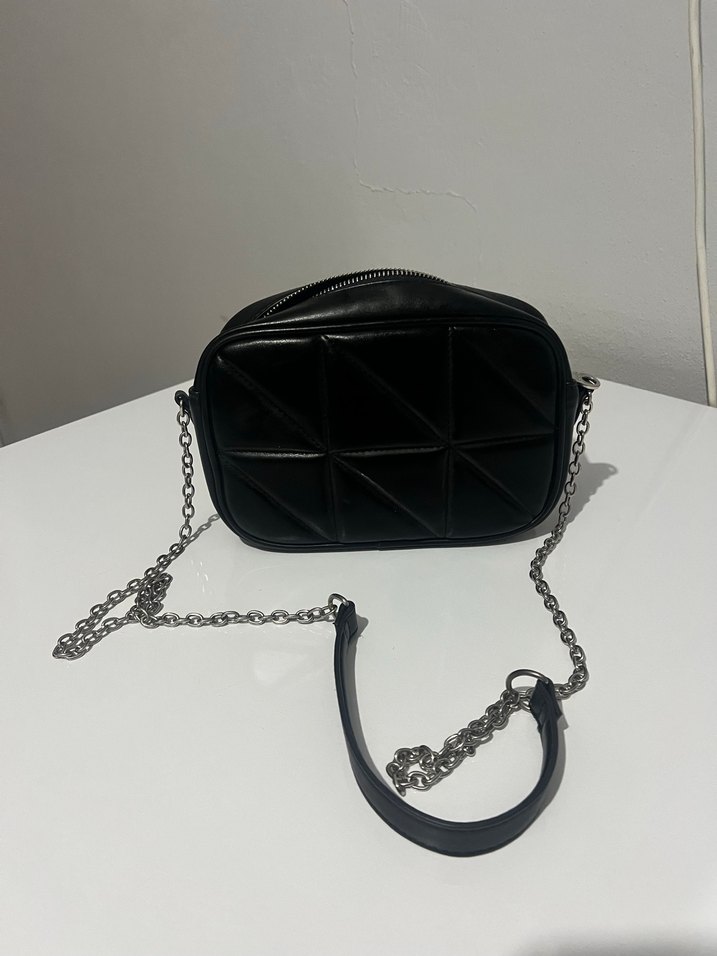 Zincir detaylı siyah deri goth çanta, desen içermeyen şık tasarımıyla günlük kullanım için uygundur.