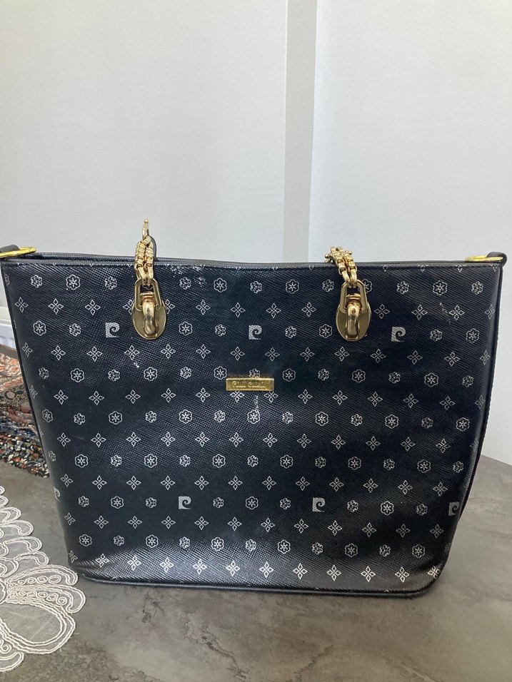 Zincir detaylı, baskılı desene sahip siyah deri kadın çanta, modern klasik tarzıyla günlük kullanıma uygundur.